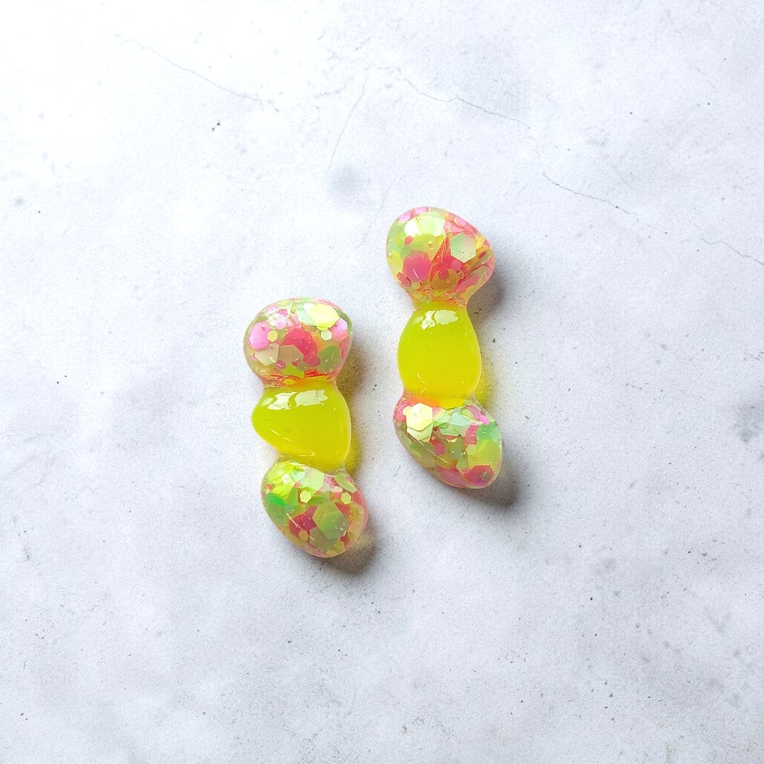 縦 約2.8cm 横 約0.8cm お菓子のようなぷるんとした小さめのピアス・イヤリング ネオンカラーが差し色になっています。 カラーは、ネオンオレンジ・ネオンパープル・ネオンイエローの3色からお選びください。