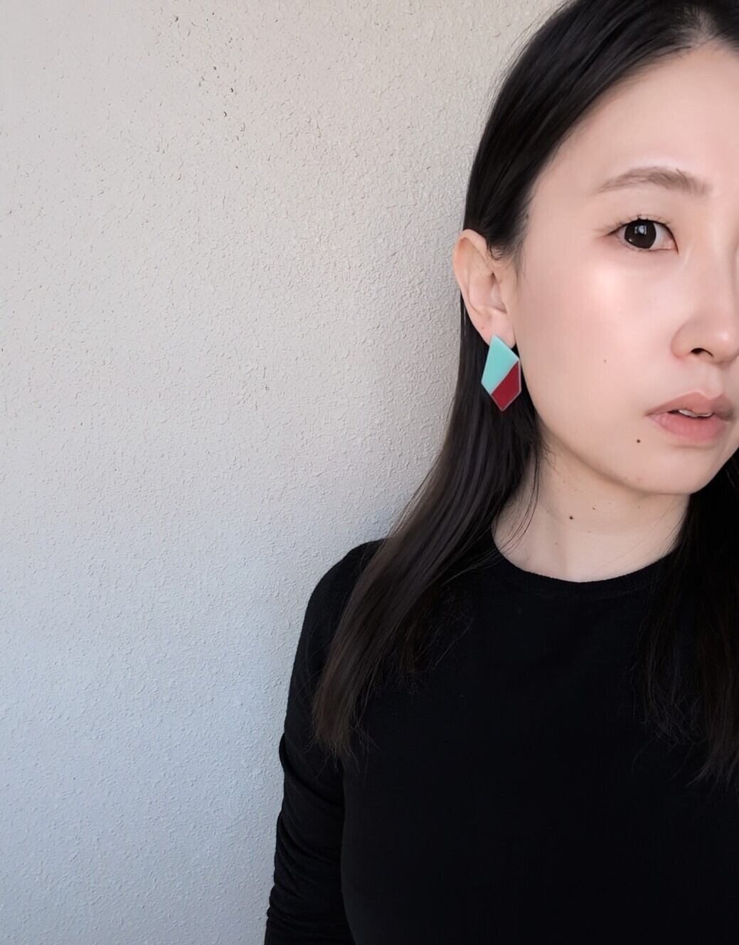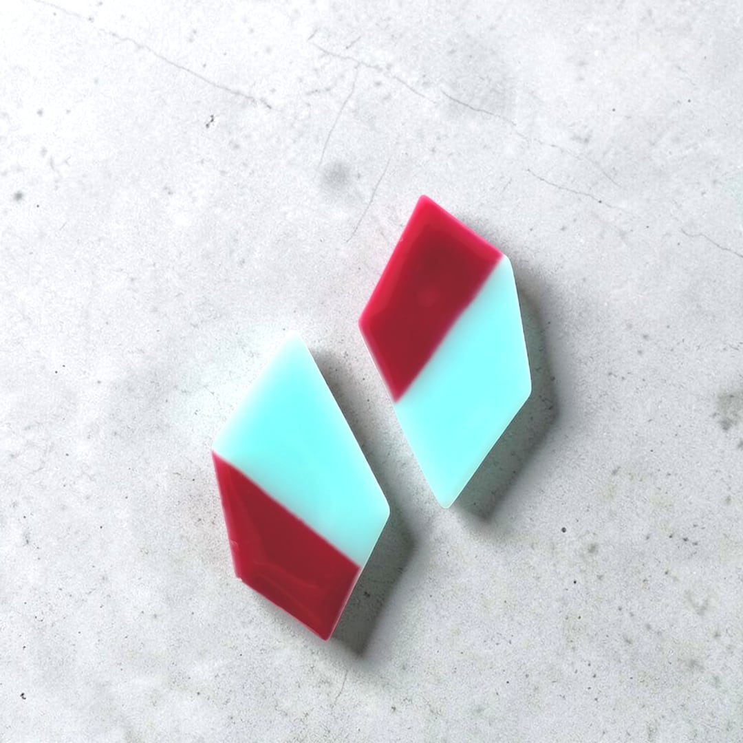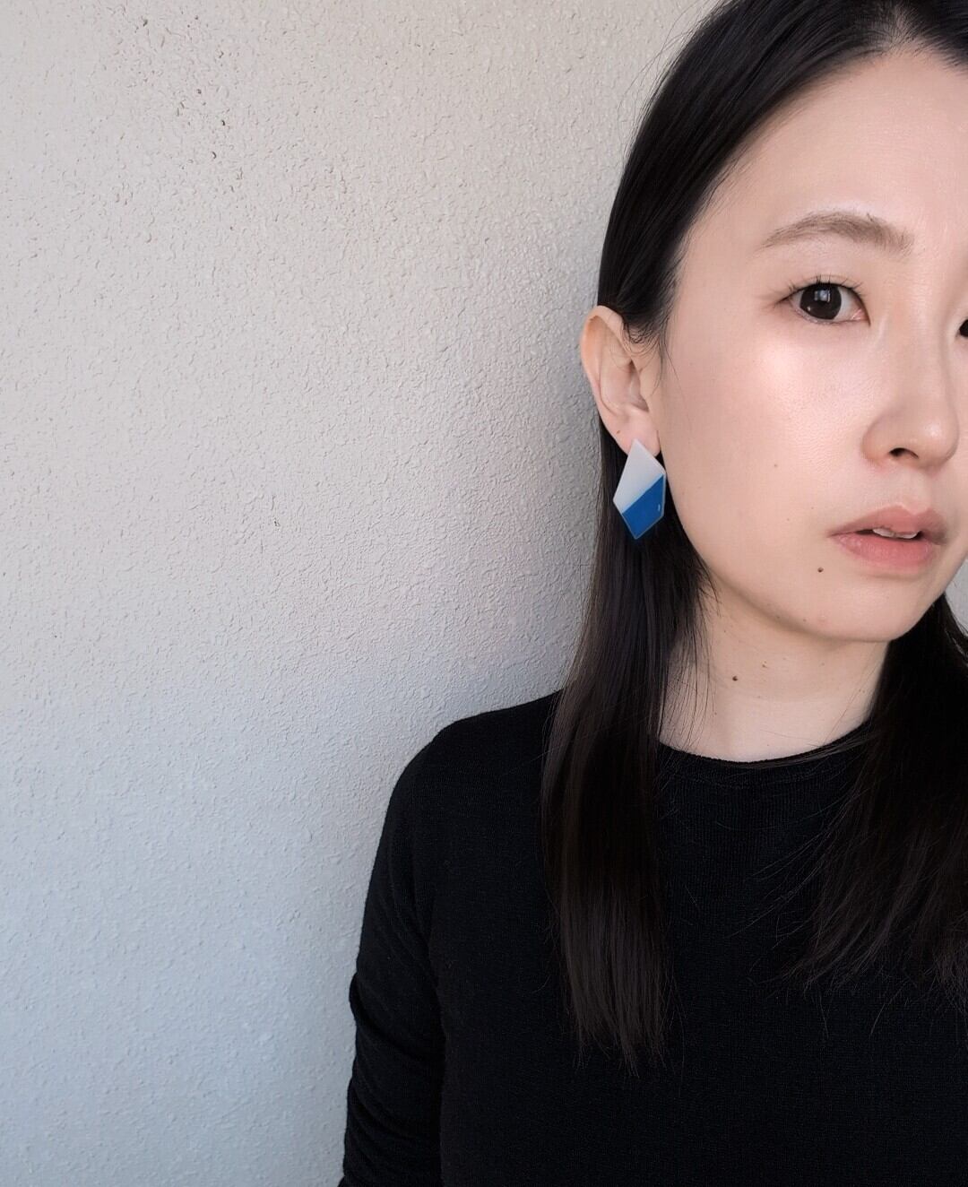 縦 約4.5cm 横 約2cm 左右非対称のピアス・イヤリング 鮮やかな配色のバイカラーです。 カラーは、パープル・ホワイト・グリーンの3色からお選びください。