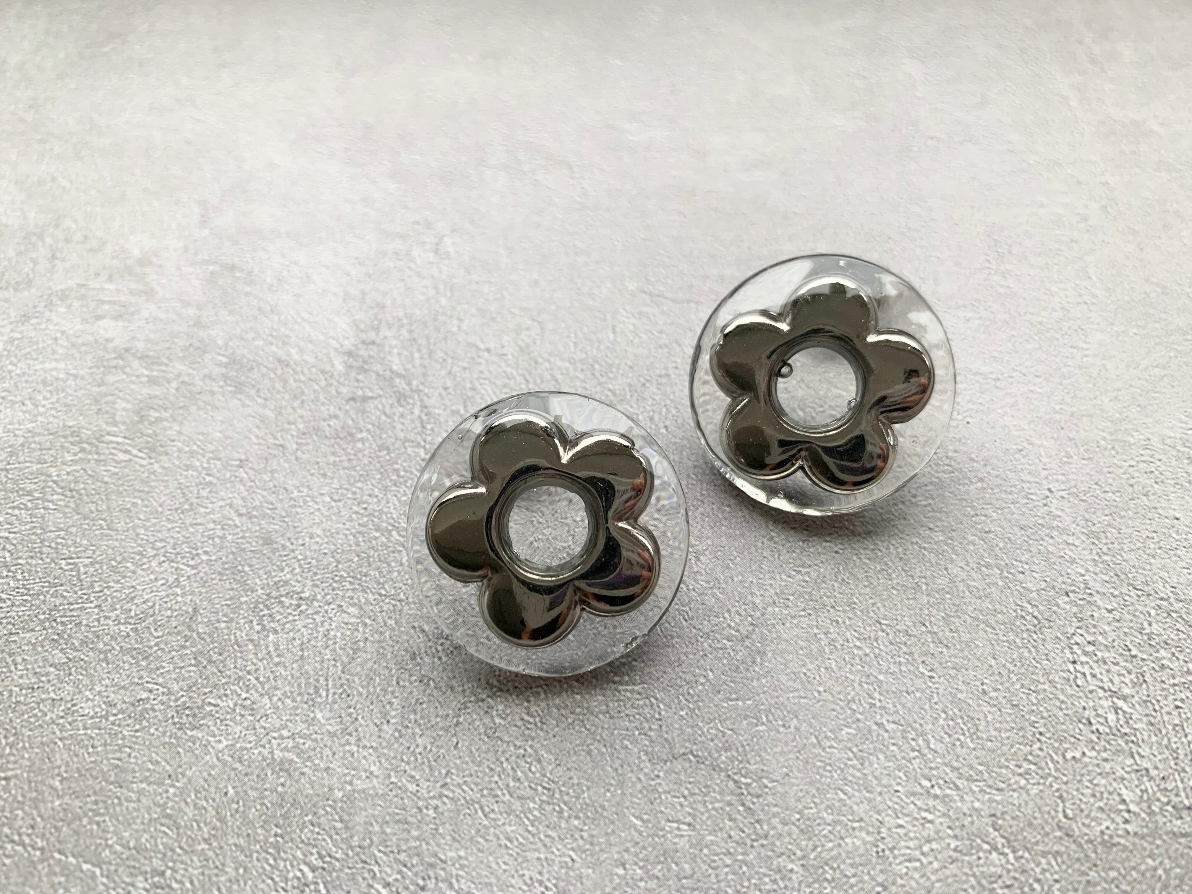 レジンの中にシルバーのお花のビーズを埋め込んだ可愛らしいピアス・イヤリング。